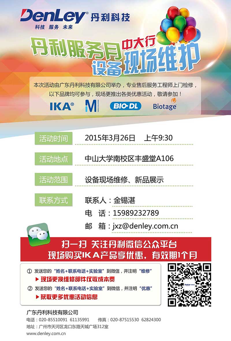 2015年3月26日上午9:30廣東丹利科技有限公司將在中山大學南校區(qū)豐盛堂A106室舉辦--丹利服務月 設備現(xiàn)場維護活動,專業(yè)售后服務工程師上門檢修,IKA、密理博、寶予德、Biotage等品牌均可參與,現(xiàn)場更推出各類優(yōu)惠活動,敬請參加!